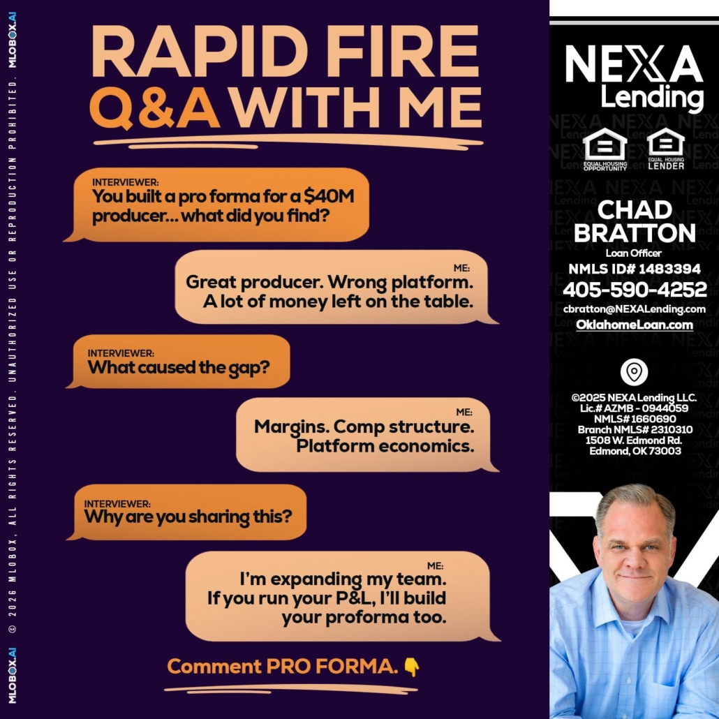 RAPID FIRE - Chad Bratton -Senior Loan OfficerHi, my name is Chad Bratton. I’m a Loan Officer with NEXA Lending LLC., offering personalized mortgage solutions, fast customized quotes, great rates and service with integrity.